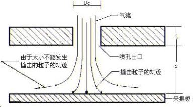 圖(tú)1給出(chū)不同(tóng)空氣動力(lì)學等效直徑的粒子在人體呼吸係統中的沉降部位(wèi),采(cǎi)樣器的設計盡可能模擬這一特(tè)性。慣性撞擊原理早在五十年代就已經提出來了。圖(tú)2給出一個噴孔附近粒(lì)子運動軌跡的示意圖。在一定的氣流速度時,一些慣性較大的粒子(zǐ)將撞擊到采(cǎi)集板上,而那些慣性較小的粒(lì)子則隨氣流繞行而進入下(xià)一級,在噴孔的幾何尺寸和(hé)氣流速(sù)度一定的(de)條件下,不同空氣動力學等效直徑的粒子其(qí)撞擊概率是不同的,其特性可用(yòng)撞(zhuàng)擊效率曲線,一般常用撞擊效率為50%的直徑值(zhí)作為這(zhè)一級撞擊器的截斷直徑,並假設空氣動力(lì)學等效直徑大於截斷直徑的粒子將被100%地撞擊(jī)。